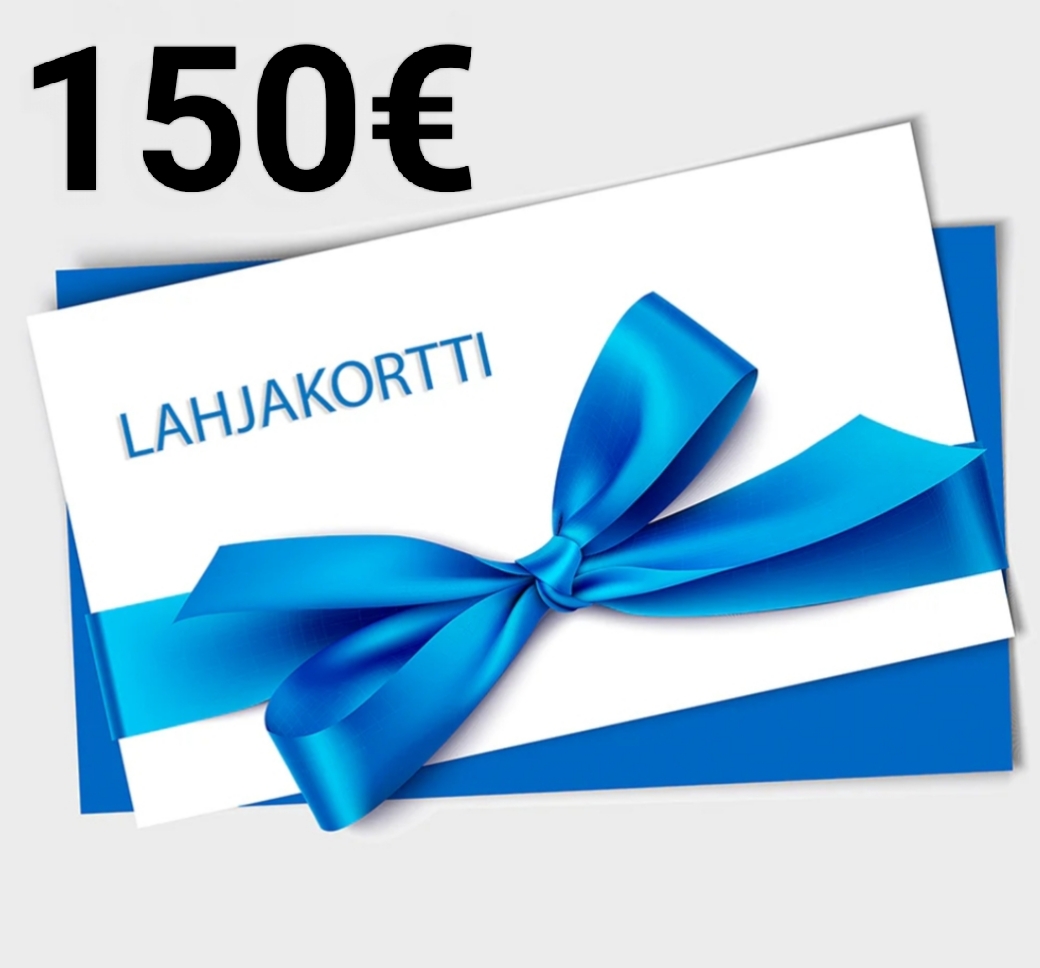 150€ lahjakortti meille, toimitetaan henkilökohtaisena alennuskoodina sähköpostiisi, tai ilmoitettuun s.postiin. Voit myös itse lähettää sen saajalle, tai tulostaa esim paperille ja kirjekuoreen lahjaksi. Toimituskuluja ei tule täältä kaupasta kun valitset nouto pajalta toimitusmuodoksi, tämä tulee suoraan s.postiisi!