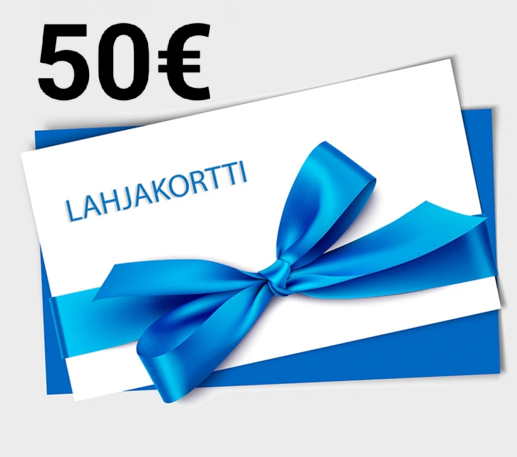 50€ lahjakortti meille, toimitetaan henkilökohtaisena alennuskoodina sähköpostiisi, tai ilmoitettuun s.postiin. Voit myös itse lähettää sen saajalle, tai tulostaa esim paperille ja kirjekuoreen lahjaksi. Toimituskuluja ei tule täältä kaupasta kun valitset nouto pajalta toimitusmuodoksi, tämä tulee suoraan s.postiisi!